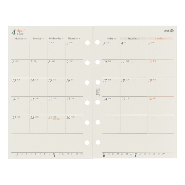 TOP 手帳 システム手帳 26 ミニ6 月間ダイアリー カレンダータイプ 週末重視型