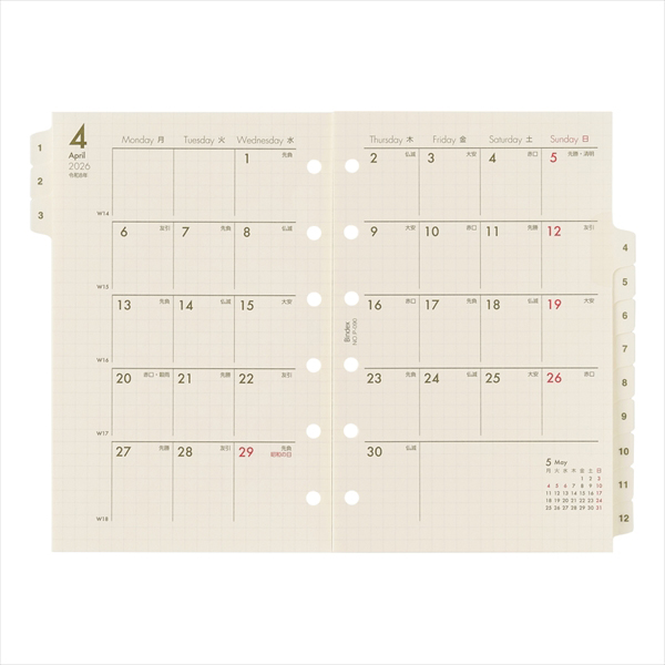 月間日記欄も方眼メモページと同じグリットになっており、違和感なく使う事ができます。