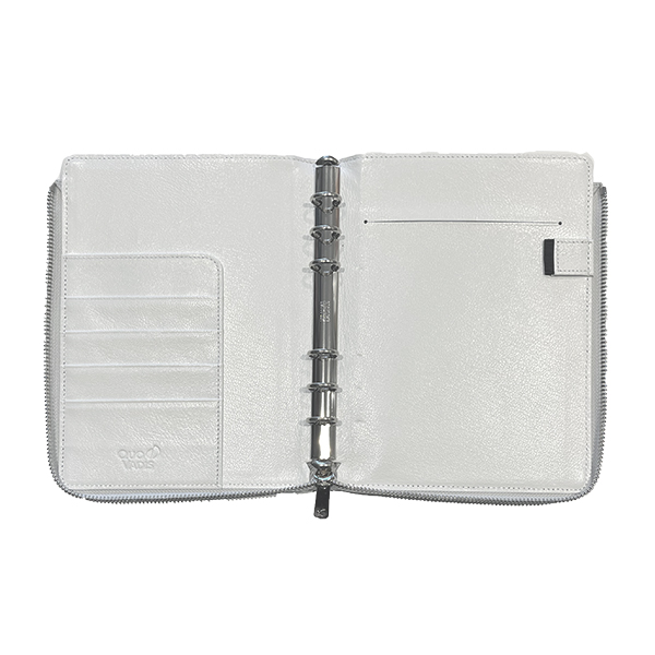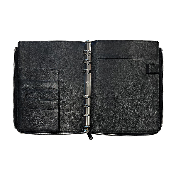 L字型ジップを採用したシステム手帳は、中身が厚くなっても開閉がしやすく、閉じたままでもペンを取り出せる便利な仕様です。