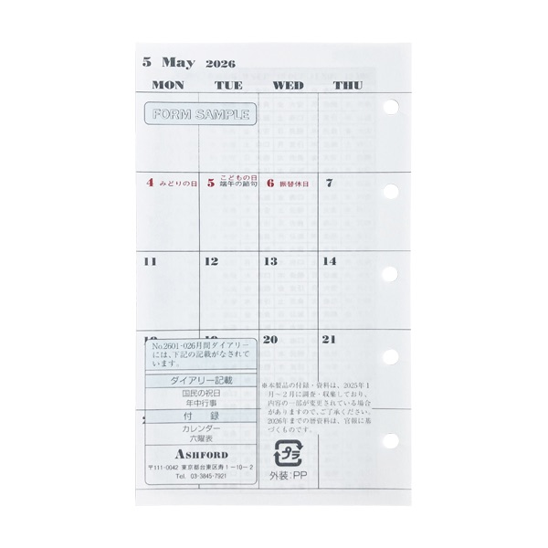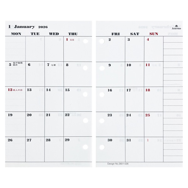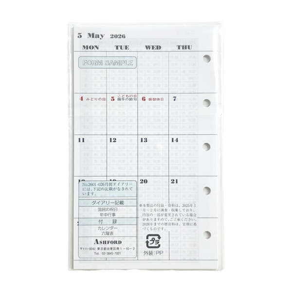 アシュフォード26 システム手帳リフィル 月間ダイアリー カレンダー式 MICRO5