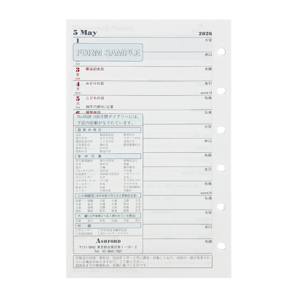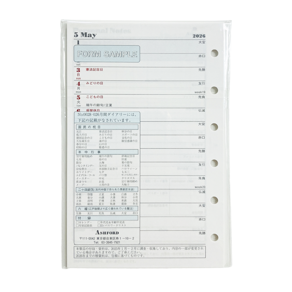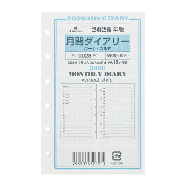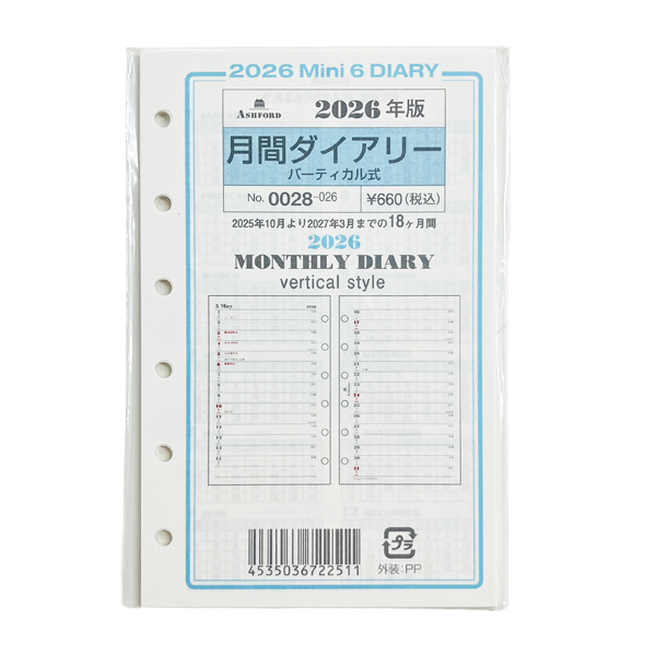 アシュフォード26 システム手帳リフィル 月間ダイアリー バーティカル式 MINI6