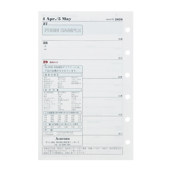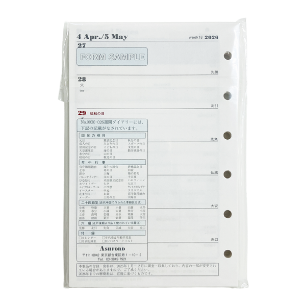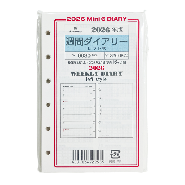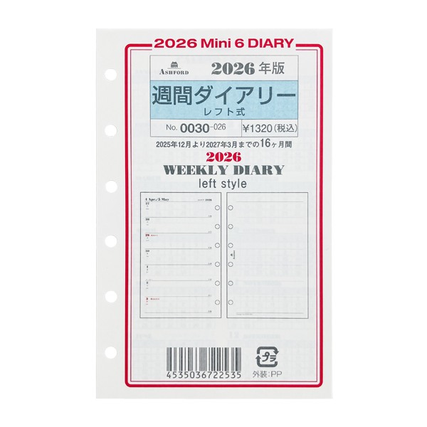 アシュフォード26 システム手帳リフィル 週間ダイアリー レフト式 MINI6