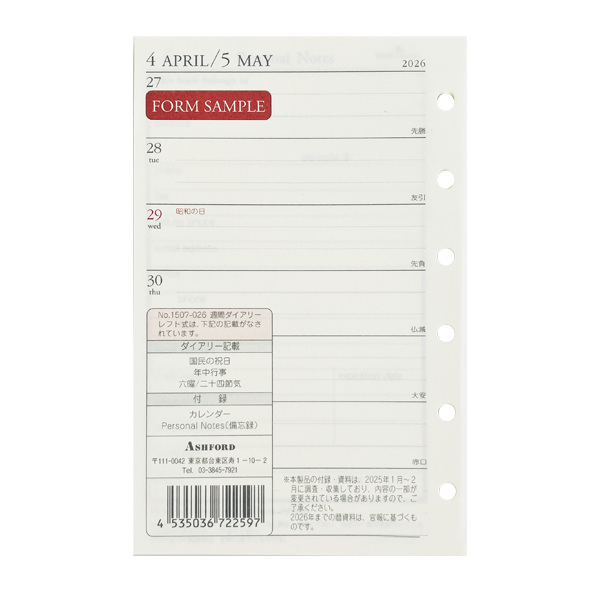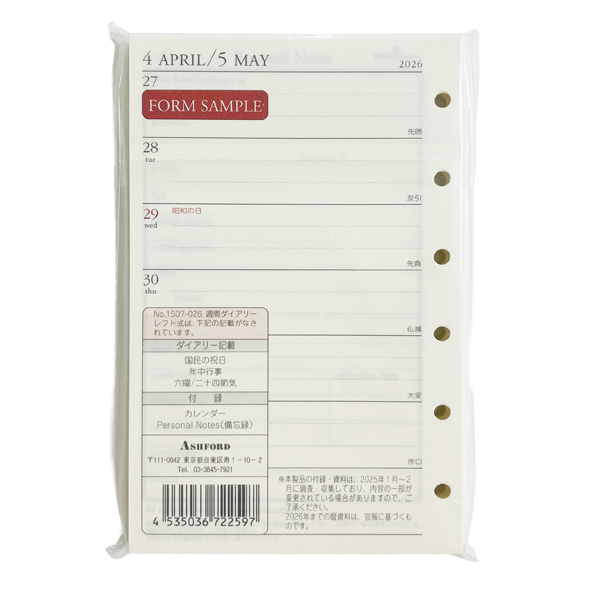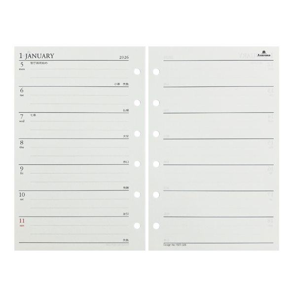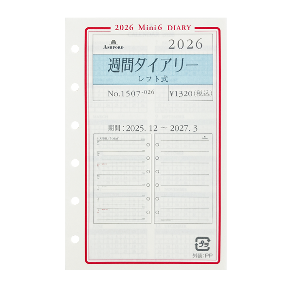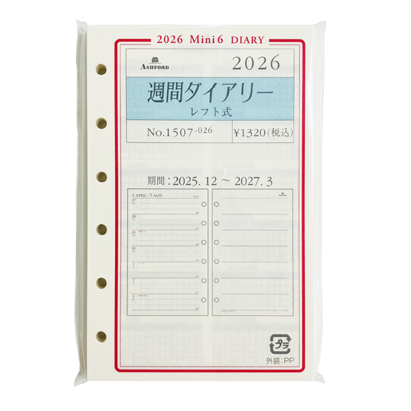 アシュフォード26 システム手帳リフィル 週間ダイアリー レフト式 MINI6<グレース>