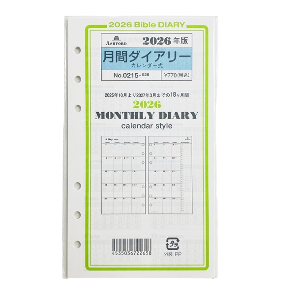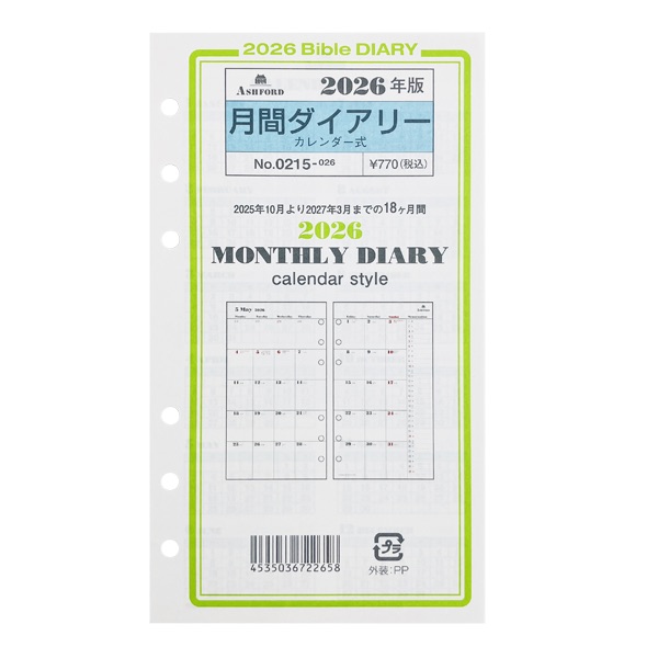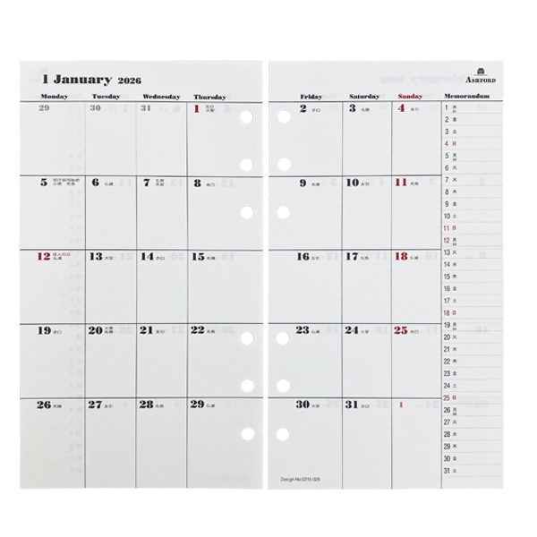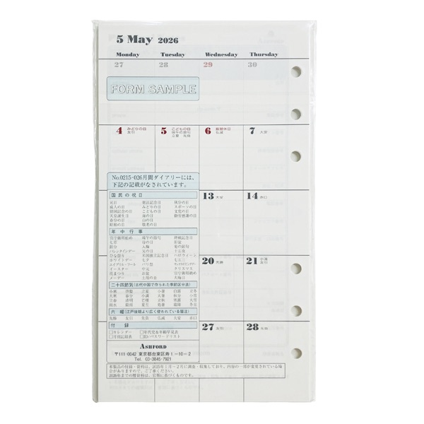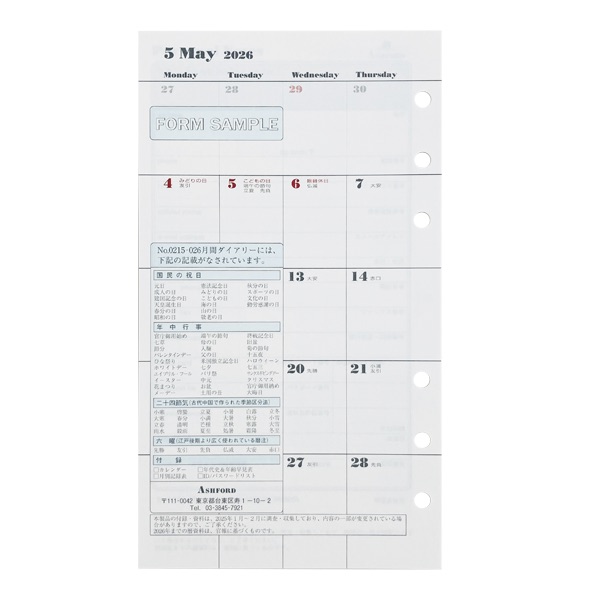 見開き1ヶ月のブロック式月間ダイアリーです。