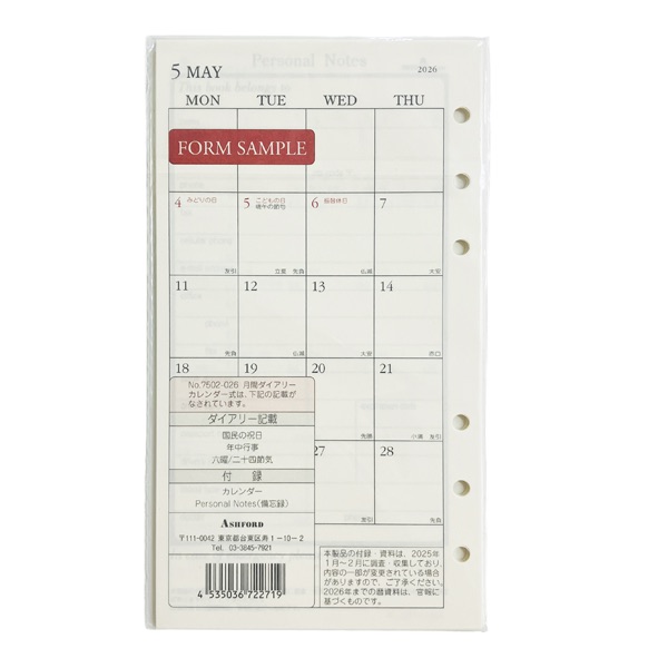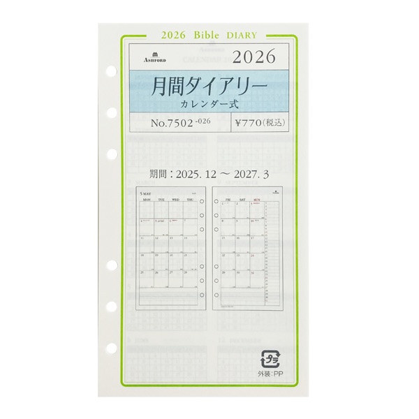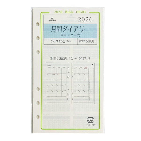 アシュフォード26 システム手帳リフィル 月間ダイアリー カレンダー式 BIBLE<グレース>