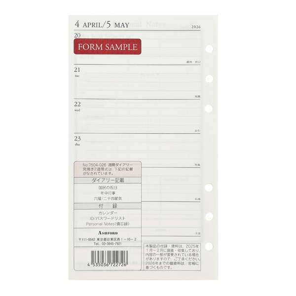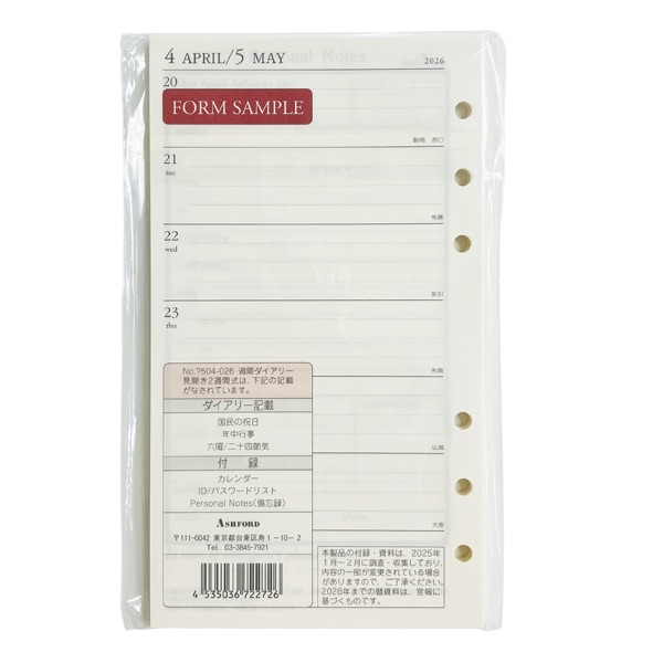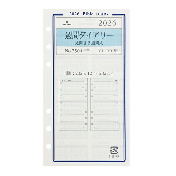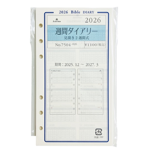 アシュフォード26 システム手帳リフィル 週間ダイアリー 見開き2週間式 BIBLE<グレース>