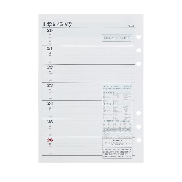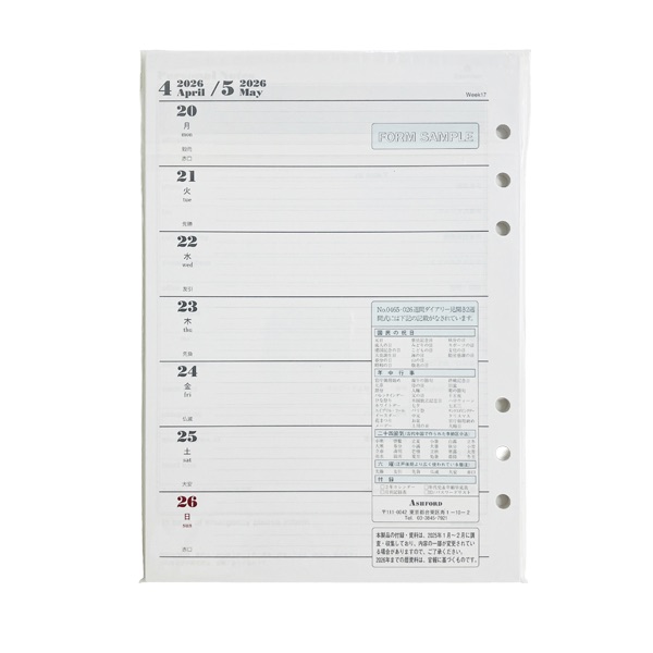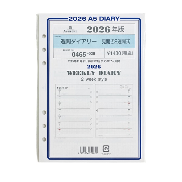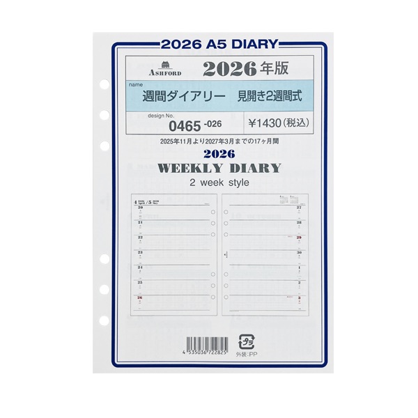 アシュフォード26 システム手帳リフィル 週間ダイアリー 見開き2週間式 A5