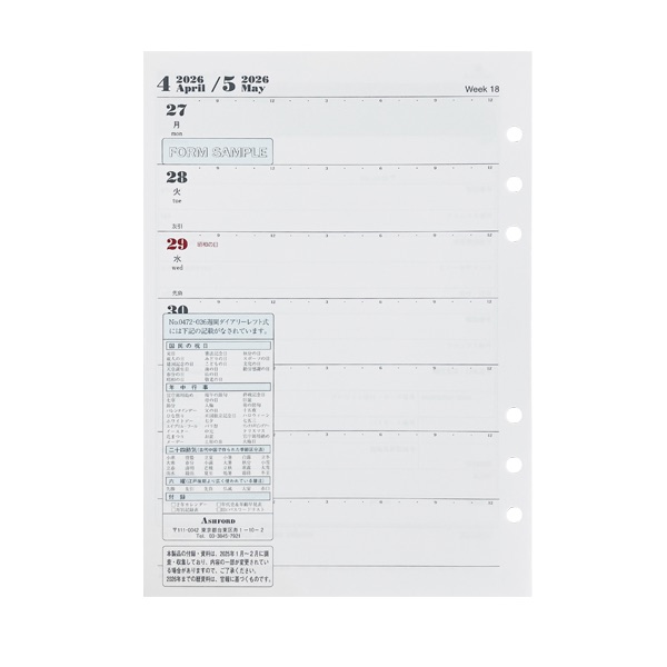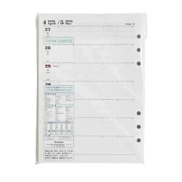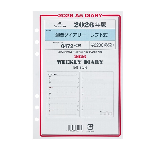 アシュフォード26 システム手帳リフィル 週間ダイアリー レフト式 A5