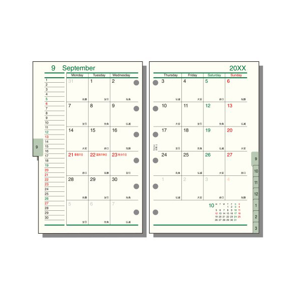 ●月間:見開き両面1ヶ月ブロック式 インデックス付