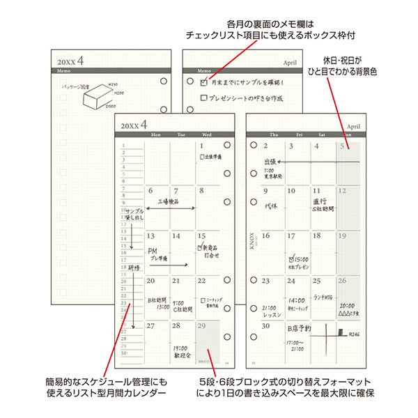 ノックス26 【ナロー】日付入見開き1ケ月間ブロック式+見開きメモ
