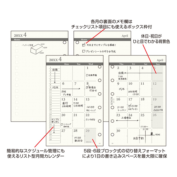 ノックス26 【ミニ6】日付入見開き1ケ月間ブロック式+見開きメモ