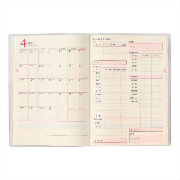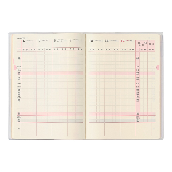 【レイアウト】「食費」などの費目ごとに管理するベーシックな週計タイプ。「年間収支記録表」「医療費の控え」など便利な巻末資料や、レシートなどの保存に便利なしおりポケット付きです。