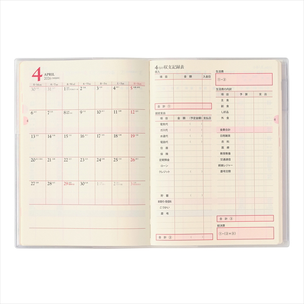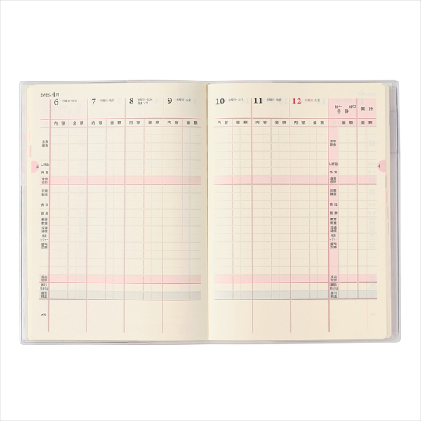 【レイアウト】「食費」などの費目ごとに管理するベーシックな週計タイプ。「年間収支記録表」「医療費の控え」など便利な巻末資料や、レシートなどの保存に便利なしおりポケット付きです。