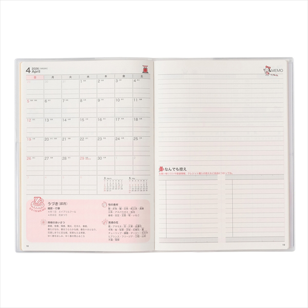 【月間ページ】見開き1ヵ月のブロックタイプ(日曜始まり)。カレンダーと同じような感覚で週ごとの予定が把握しやすいのが特長です。