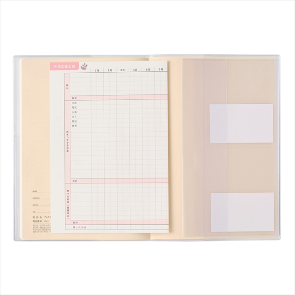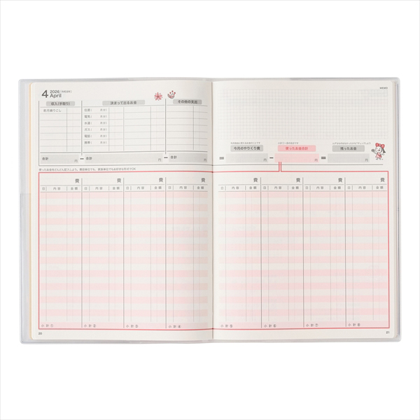 【家計管理】1ヵ月単位で費目ごとに家計管理ができるタイプ。年間収支記録用の別冊シートやレシートなどの保管に便利な「しおりポケット」付きです。