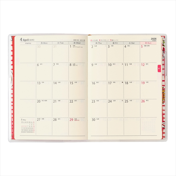 【月間ページ】見開き1ヵ月のブロックタイプ(月曜始まり)。