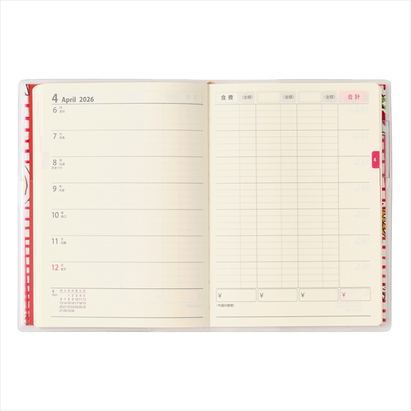 【家計管理】見開き1週間で、左頁はスケジュール管理、右頁は費目ごとに家計管理ができる週計タイプ。持ち運びにも便利なコンパクトサイズなので、手帳感覚で使用できるのが特長です。