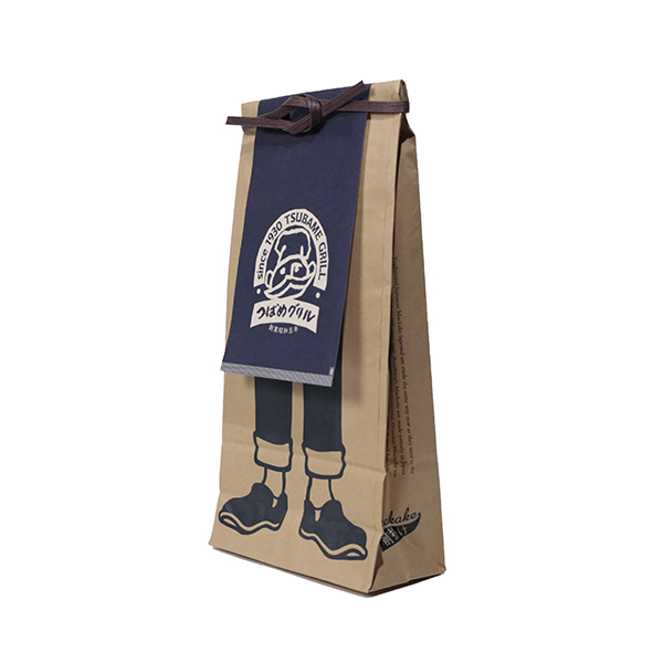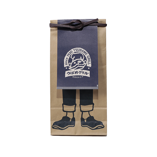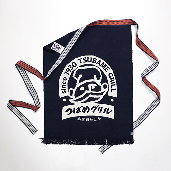 前掛けの柄は、1950年頃から画家の鈴木十五朗先生に描いて頂いている店のロゴ文字や挿絵を用い、当時の印象を残してデザインしたものです。