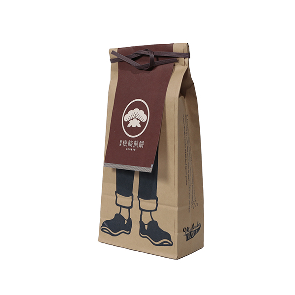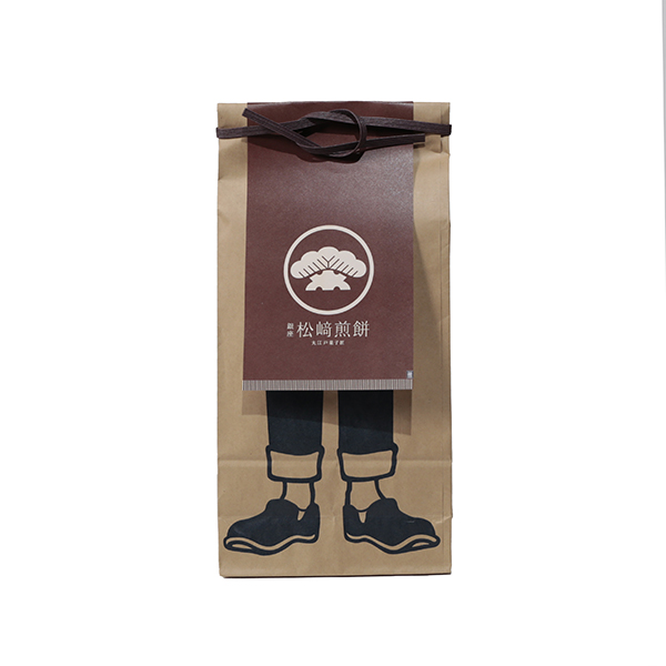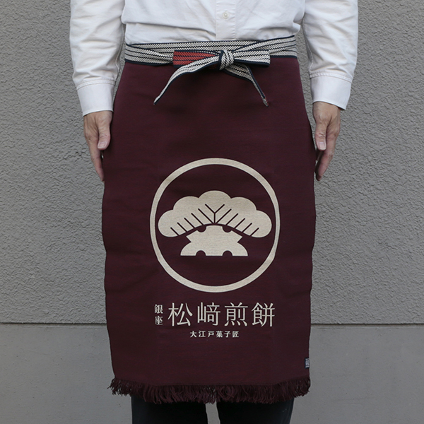 前掛けのデザインは、2007年、ブランドリニューアルをした際に作られた銀座 松崎煎餅のロゴです。