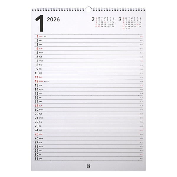 書き込めるスペースが広く、複数のスケジュール管理にも最適なB3サイズ横書きのカレンダーです。