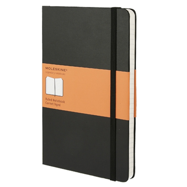 ビジネスノートやダイアリーとして、また、旅先での思い出を綴るのにお使いいただける6mmルールド(横罫)ハードカバー ブラック表紙 ラージサイズの定番ノートブックです。オイルクロスで覆われた硬い表紙、丸みを帯びた角、中性紙、糸綴じ製本、頑丈な表紙を閉じておく為のゴムバンド、使用中のページがひと目でわかるしおり、裏表紙内側にはクロス地で補強された拡張ポケット付きです。240ページ