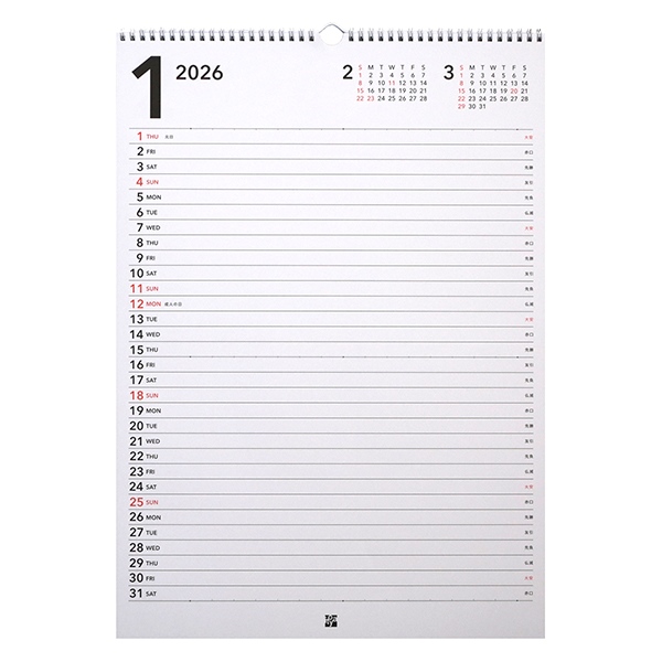 3ヶ月のスケジュールを一度に見渡せるカレンダーです。ご家族のスケジュール共有など、使い方は自由自在。2025年より用紙と文字サイズを変更し、台紙に翌年1月の記載を追加しました。