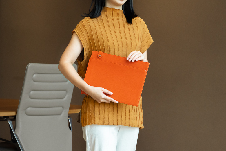 オフィスで手荷物を運ぶときも同様。パソコンやノートと重ねて持っても、収まりがよく手元がすっきり。会議室へ移動する姿を美しく整えます。