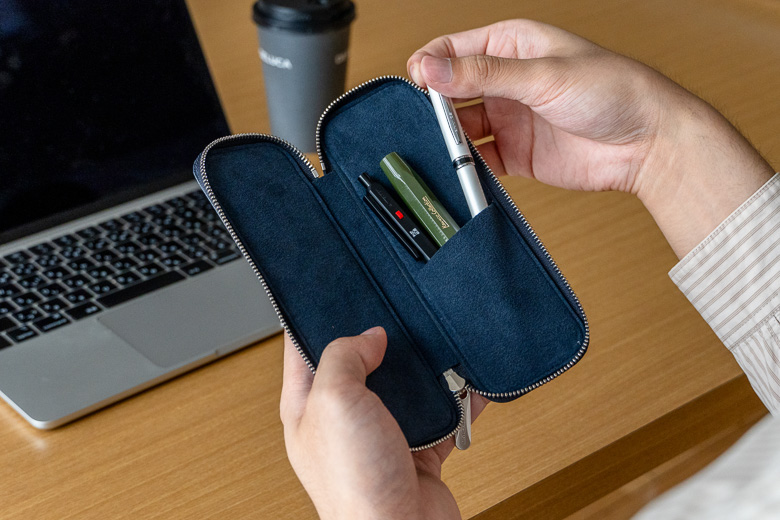 筆記具を一列に並べてサンドするように収めるスリムタイプ。自分に必要な筆記具を数本運びたい場合に役立つ、美しさと扱いやすさを両立させたペンケースです。