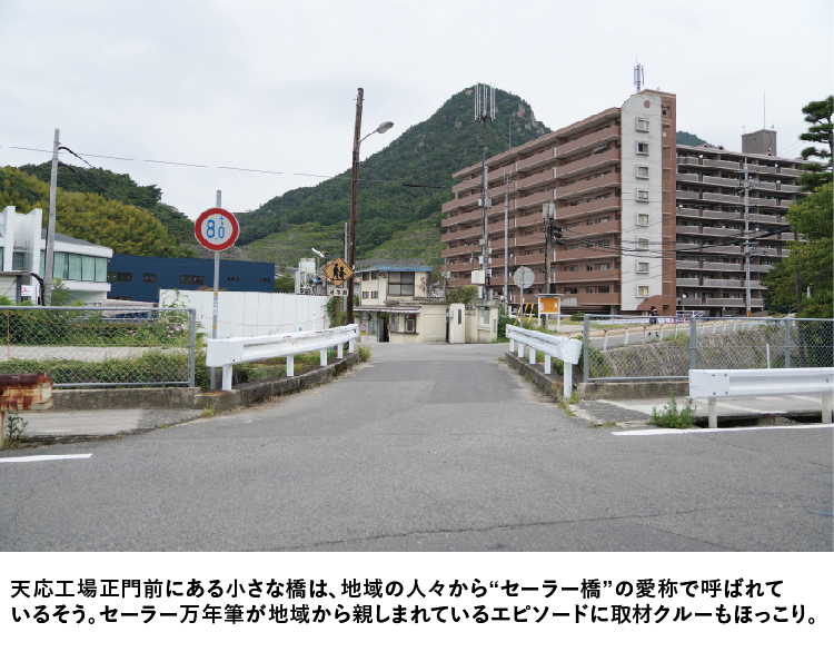 瀬戸内海地域特有の蒸した海風を受けながら、呉線の線路沿いに歩くこと約15分。セーラー万年筆の錨(いかり)のモチーフの描かれた看板と工場の正門が見えてきました。